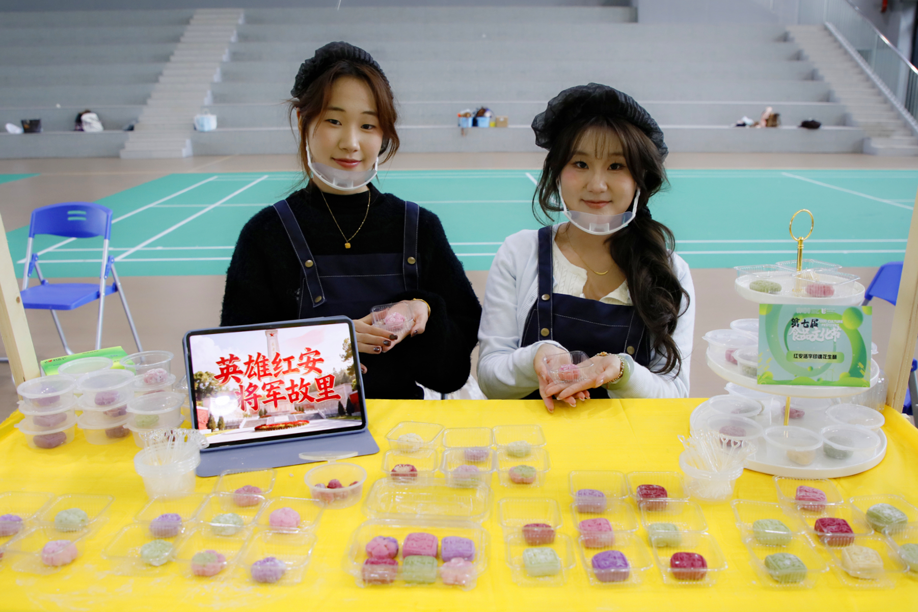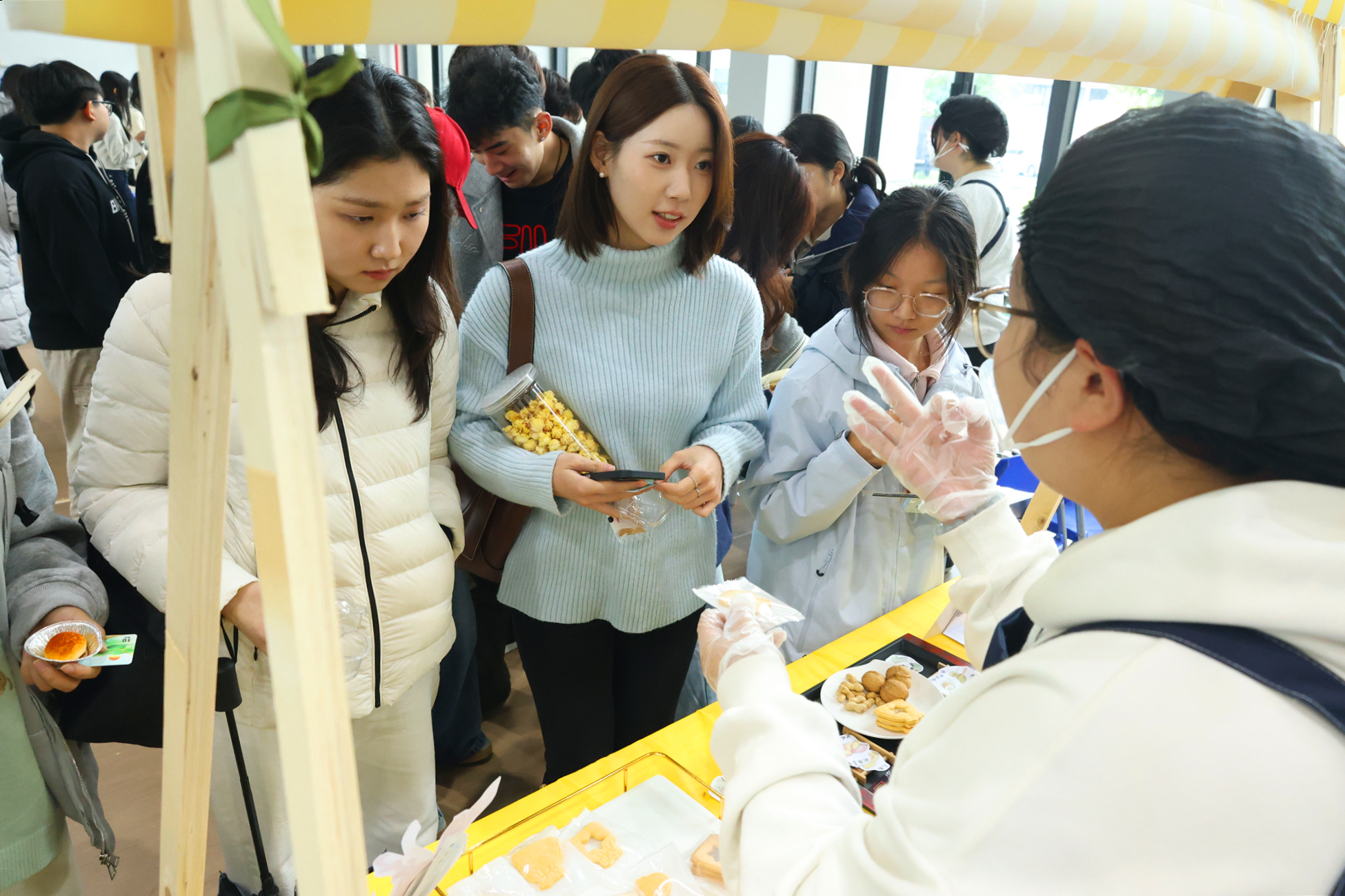 “红安苕盲盒·长征轻口袋”、“五色小小酥”、“步步糕升”、“傣香芋韵”……仪式结束后,食品工艺组教师卢静静带领着与会嘉宾和师生们移步食品品鉴区,逐一介绍学生们的创意产品。多民族、多地域的创意食品展示与品鉴,让大家频频驻足,活动现场氛围热烈,师生们通过手中的积分卡“购买”产品,最终会通过各组获取积分的情况评选出“最佳人气”及“最受欢迎”等奖项。“这些食品太有意思了,外观精致,味道很惊艳”来自韩瑞大学的韩国留学生们在品尝完食品后赞不绝口。