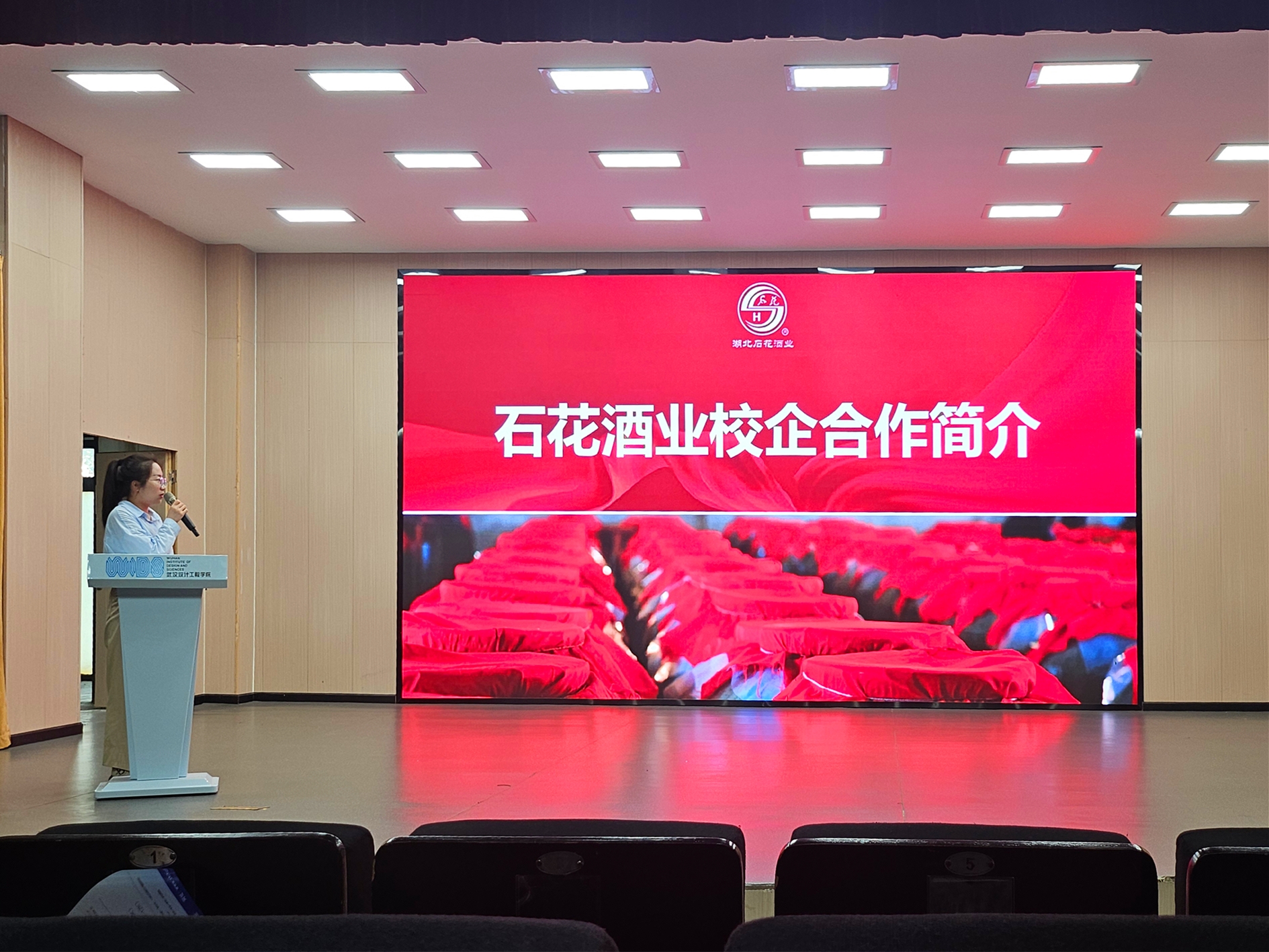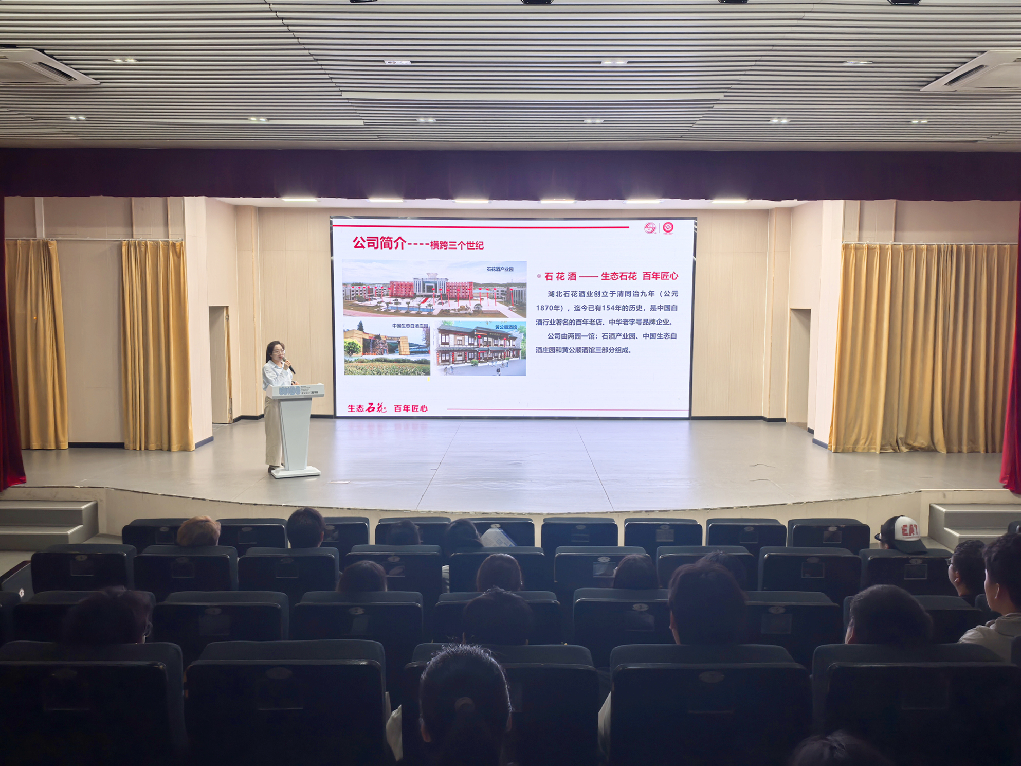 宣讲会伊始,一段精心制作的石花酒业宣传片迅速吸引了在场同学的目光。影片生动展现了石花酒业深厚的历史底蕴、卓越的行业地位以及对生态酿造理念的不懈追求,为后续深入介绍奠定了良好基础。