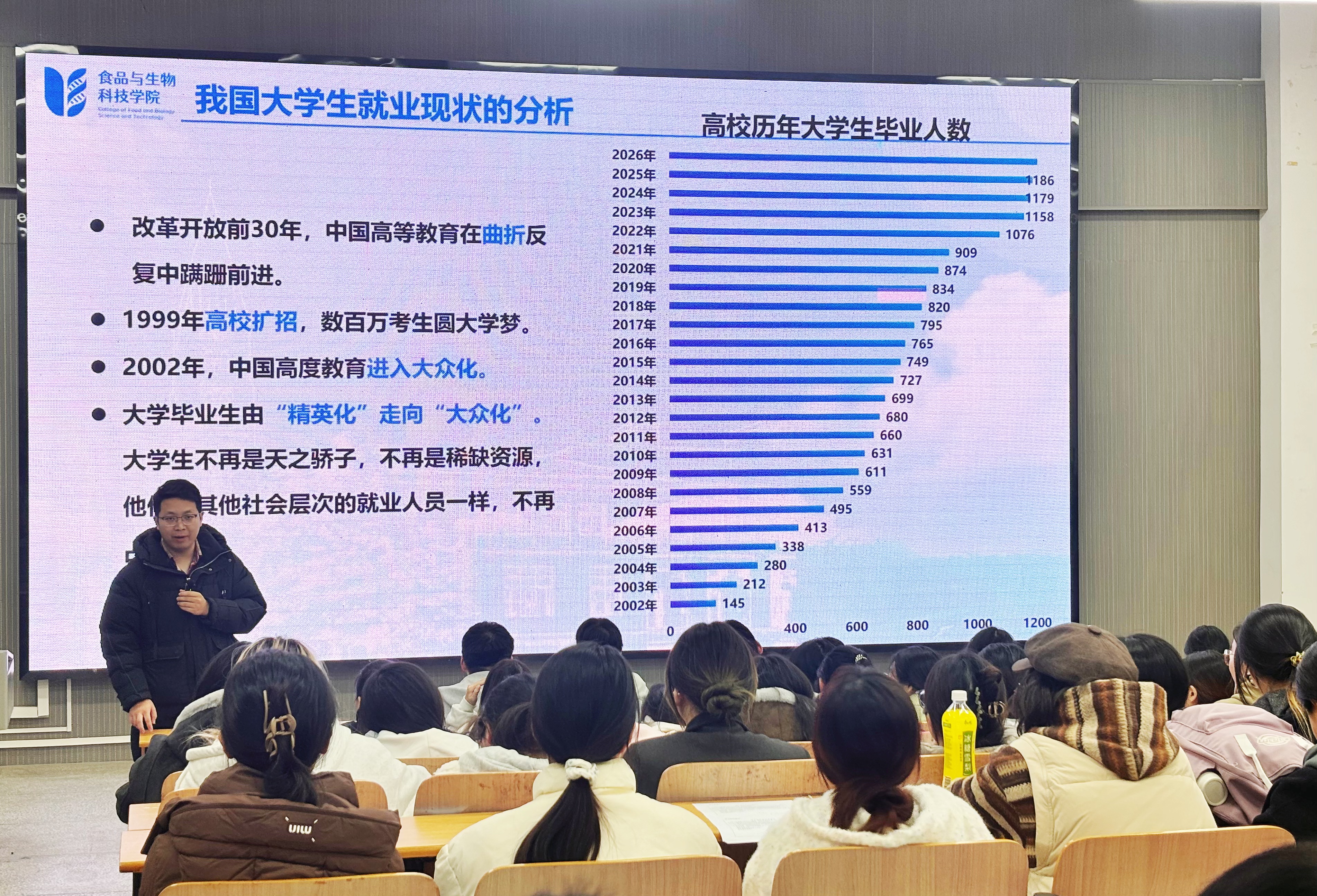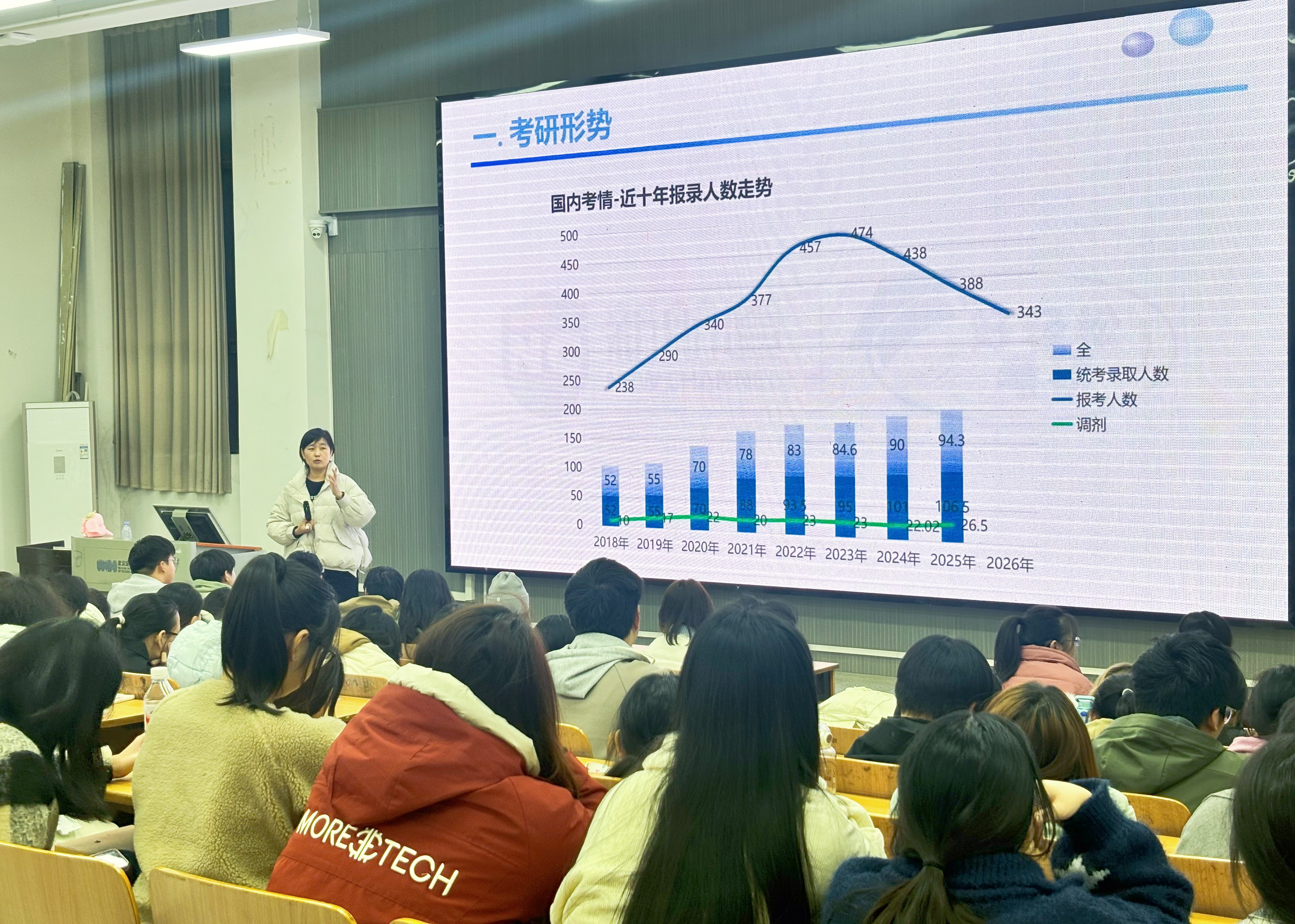 副院长付晓燕则结合我院历年考研数据,以考研基本常识、考研形势分析、目标确定与备考规划、复试与调剂等板块为重点,系统介绍了考研完整流程、考研上岸要求及最终录取标准。针对现阶段考研形势,付晓燕强调,学生应立足自身实际,结合院校与专业特点理性择校,避免盲目跟风,做好两手准备。且学院将全程为考研学生保驾护航,全体专业课教师均可提供报考咨询、复习指导等服务,呼吁同学们积极利用学院资源。