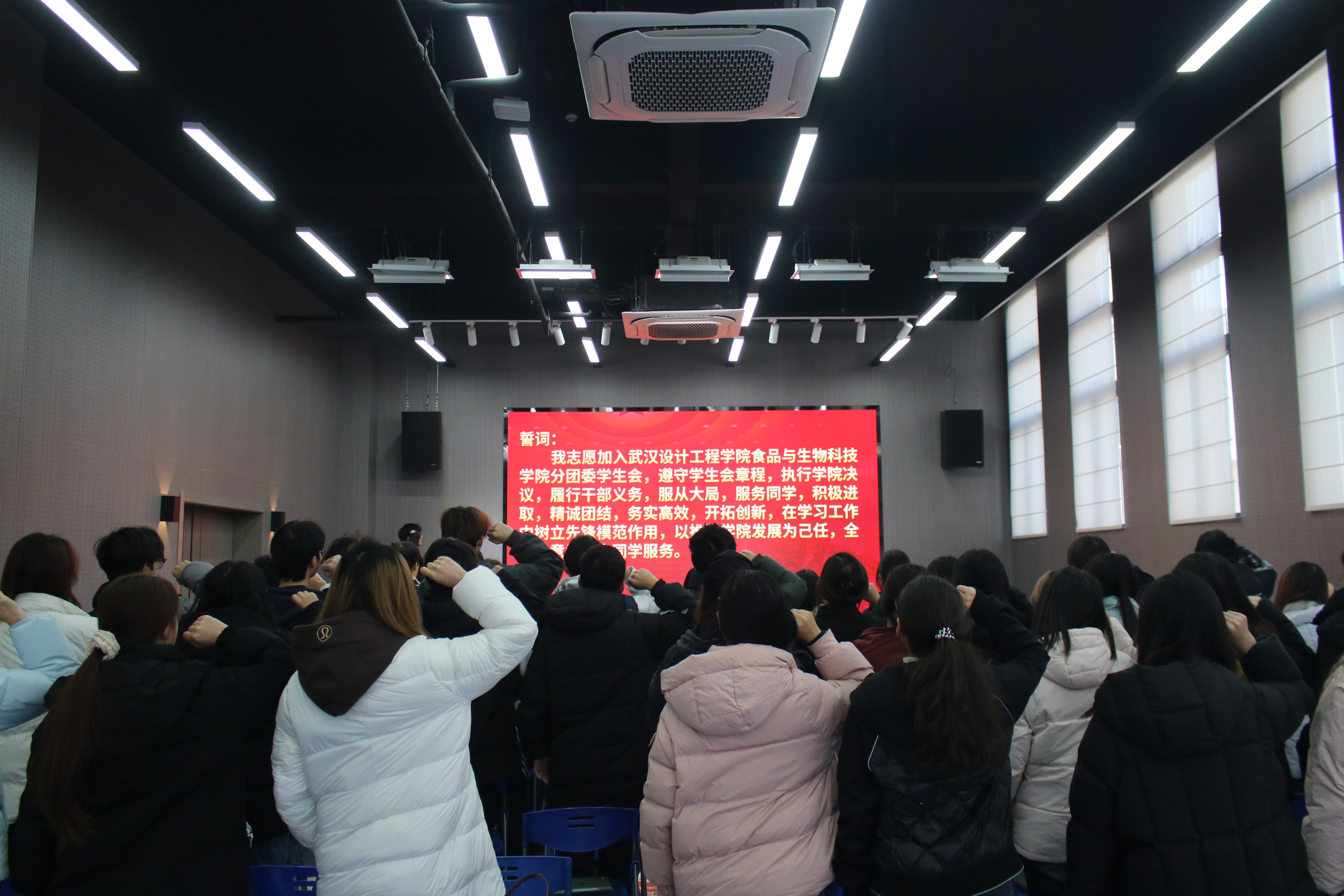大会第五项,分团委学生会集体成员宣誓。全体成员起身肃立,高举右拳,在领誓人罗前锦的带领下庄严宣誓:“我志愿加入武汉设计工程学院食品与生物科技学院分团委学生会,遵守学生会章程,执行学院决议,履行干部义务,服从大局,服务同学,积极进取,精诚团结,务实高效,开拓创新,在学习工作中树立先锋模范作用,以推进学院发展为己任,全心全意为广大同学服务。”铿锵有力的誓言响彻会场,字字句句彰显着青年学子的初心使命与坚定决心。