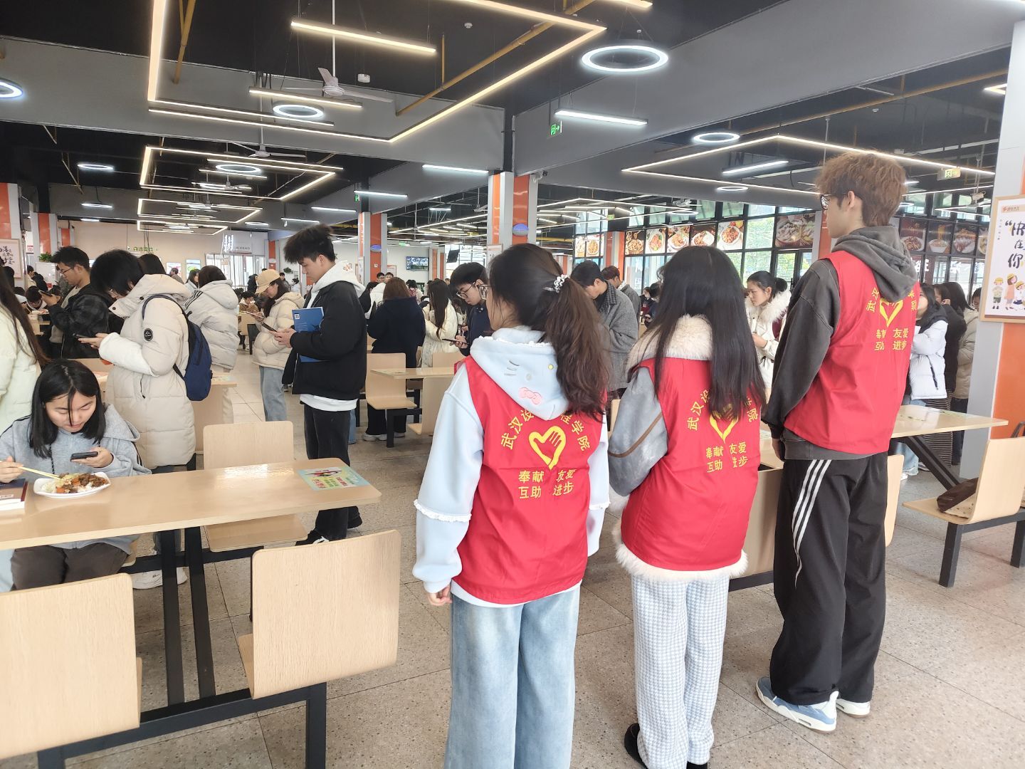 食堂里,另一抹志愿红同样温暖。志愿者们分上午、下午两个时段值守,化身文明劝导小使者,用温柔的话语传递校园温情。