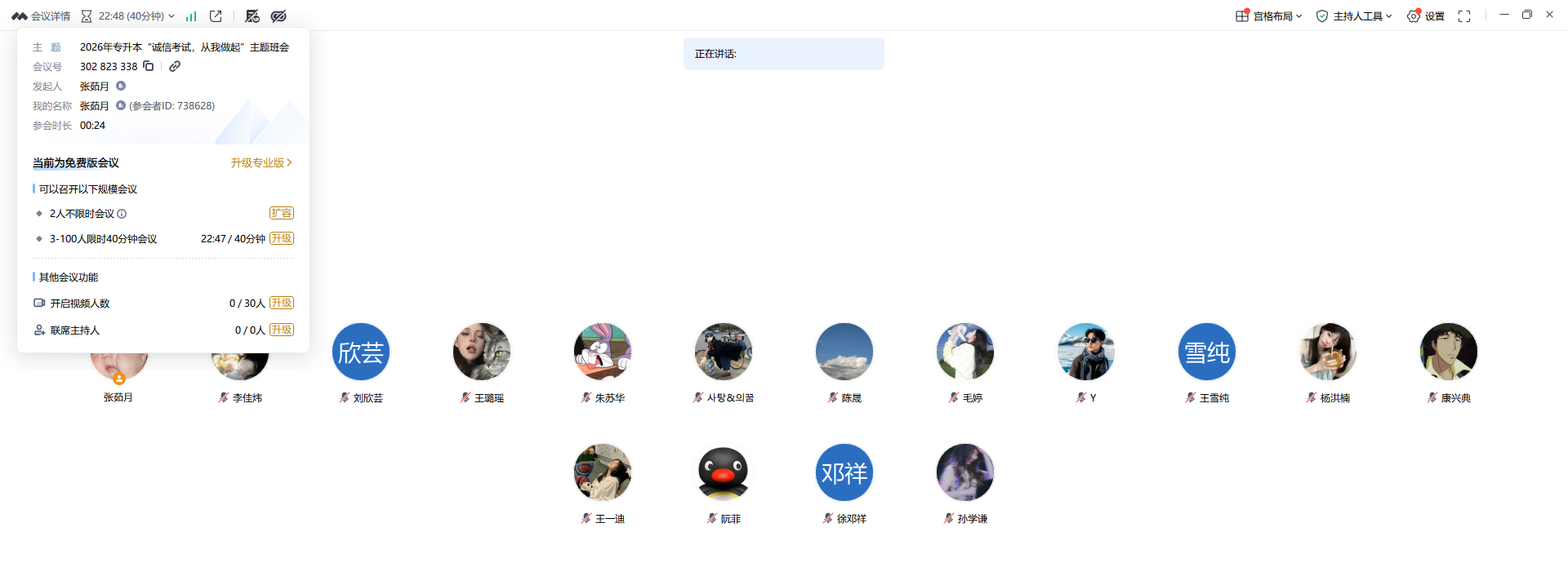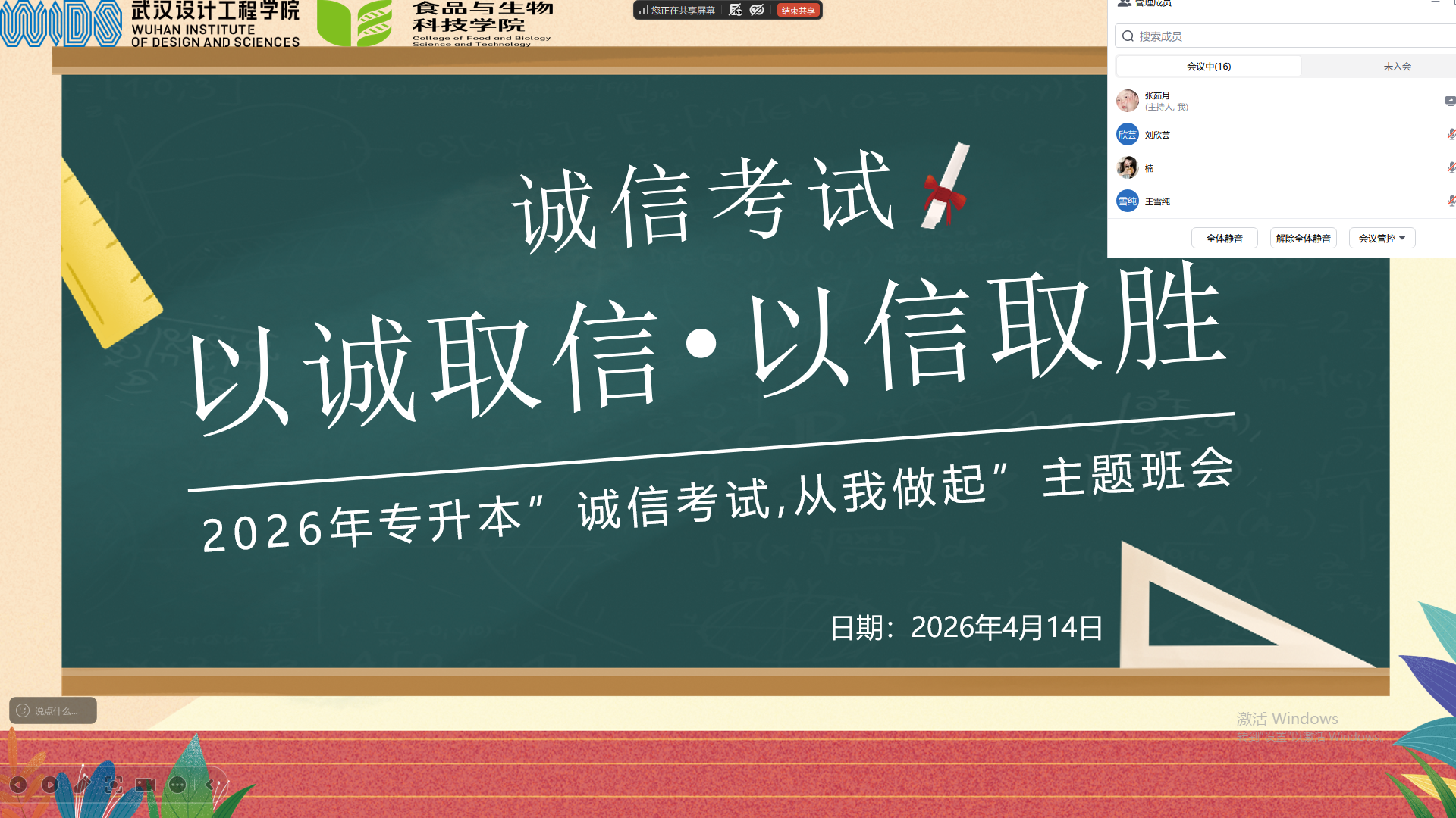 本网讯(通讯员 张茹月)2026年普通专升本考试在即,为严格落实湖北省教育厅工作要求,严肃考风考纪,筑牢诚信防线,4月14日16点,食品与生物科技学院针对食品营养与健康2301班学生开展专升本考前诚信教育。全体同学通过腾讯会议平台参加学习,会议由辅导员张茹月主持,围绕《国家教育考试违规处理办法》及考试纪律要求,结合近年来考试作弊典型案例,深入剖析了违规行为的严重后果,勉励全体考生以诚信为标尺,以专业为根基,在严谨规范的考务安排下,交出一份兼具学识素养与道德品格的“诚信答卷”。