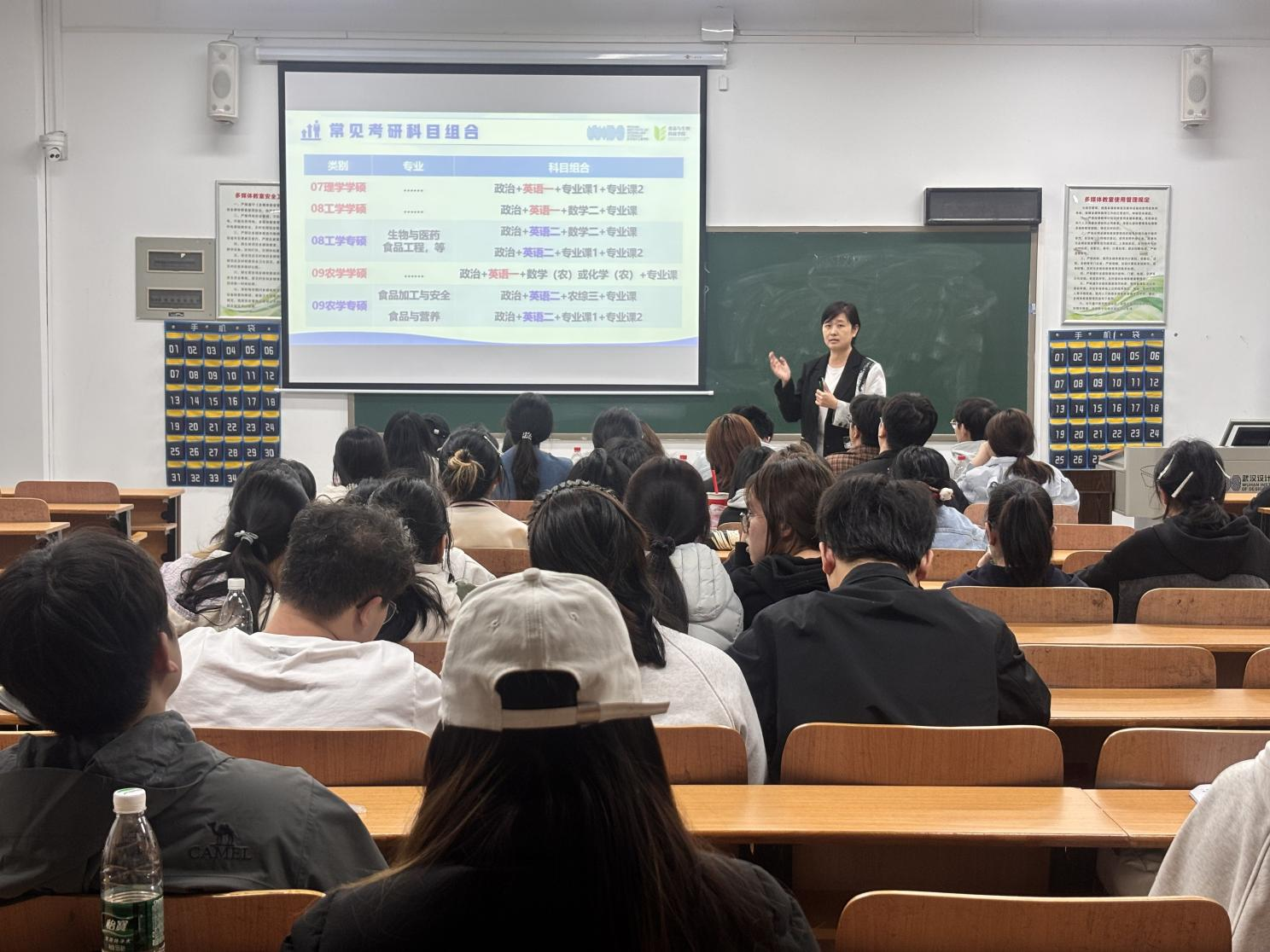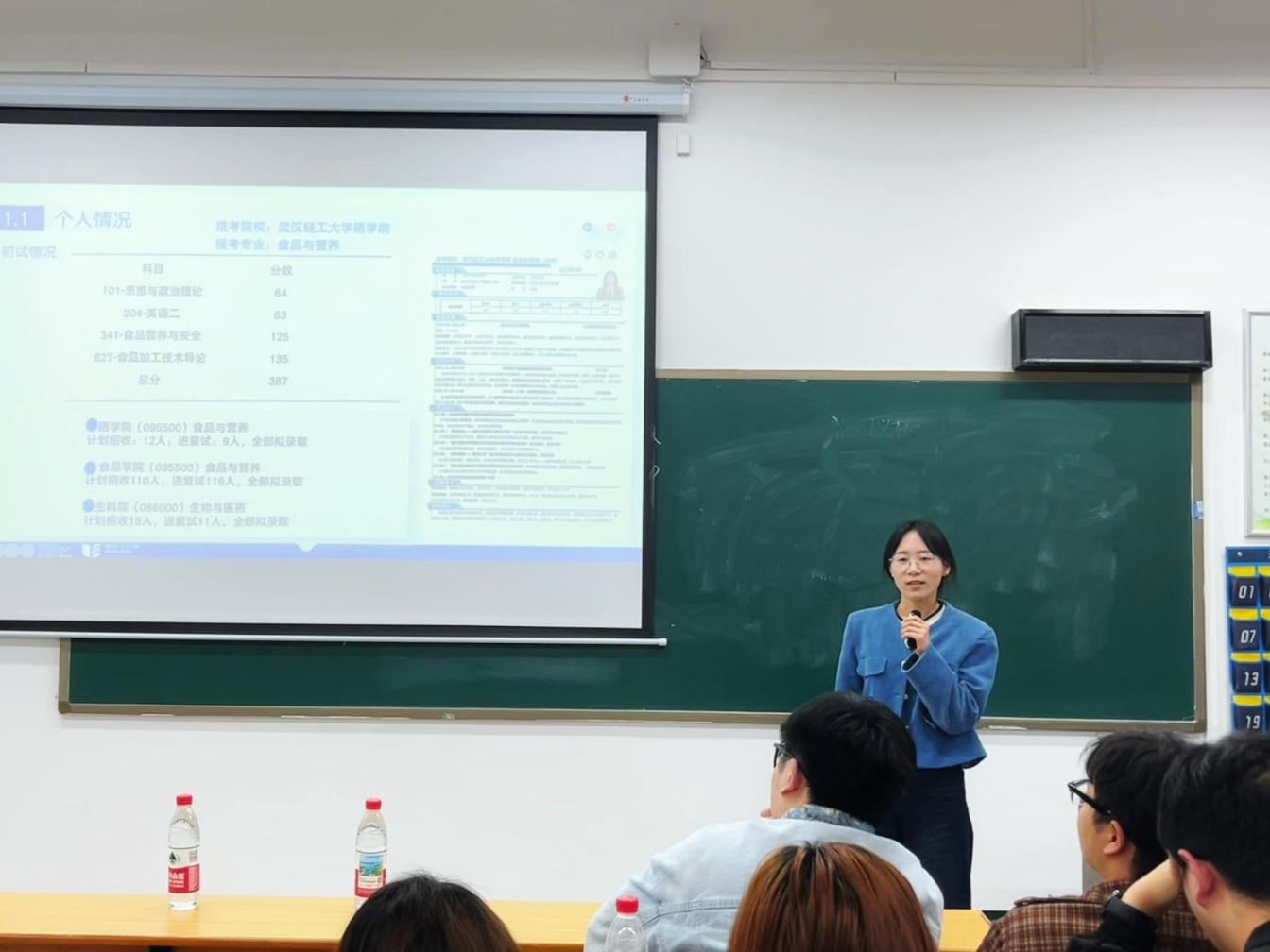 会议伊始,付晓燕介绍了学院2026届毕业生升学整体情况,共计38名食生学子被武汉理工大学、西南大学、宁波大学、湖北大学、湖北工业大学、武汉轻工大学等高校录取,不仅展现了学院优良学风与育人成效,也帮助考研学生树立了考研信心。同时,付晓燕围绕常见考研科目组合、择校策略等内容为同学们提供了全方位、系统化的报考指导与建议。